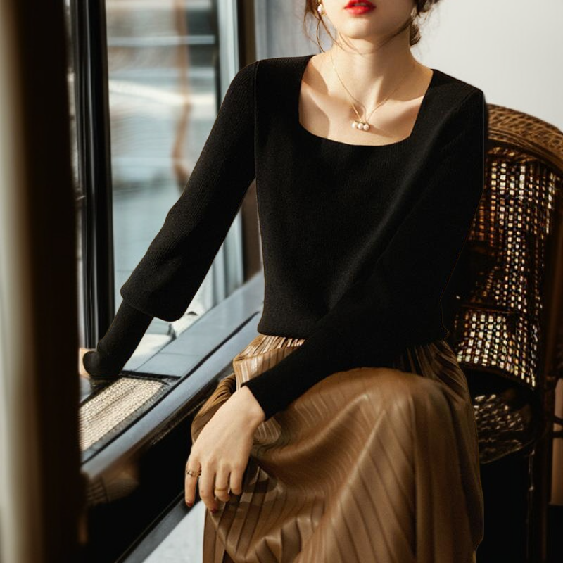ジャンパー女性気質ニットボトムシャツスクエアネックランタンスリーブニットウェアエレガントなインナートップス